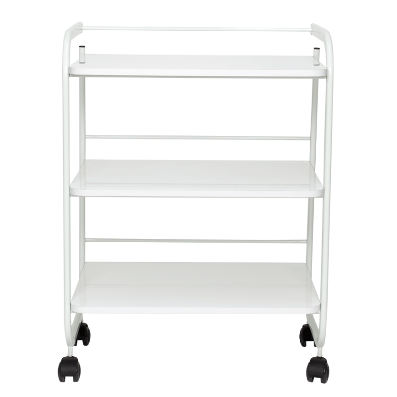 Guéridon sur roulettes avec structure métallique et 3 étagères spacieuses. Ce chariot de rangement est facile à nettoyer. Disponible en 2 coloris : noir et blanc. Guéridon chariot de soins idéal pour les instituts de beauté et centres esthétiques.