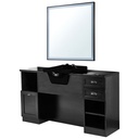 Le magnifique meuble barbier JULES B02 s'intégrera parfaitement dans votre salon de coiffure barbier tout en apportant un style élégant et sophistiqué grâce à sa structure en bois naturel de couleur noire, ses moulures en bois massif ainsi que son miroir rond équipé d'un éclairage à LED. De plus, il bénéficie de plusieurs tiroirs et étagères pour exposer vos produits et optimiser votre espace de travail. Le plan de travail est recouvert par un verre de protection étanche. Il est doté d'une vasque en céramique ainsi que d'une pomme de douche extensible.