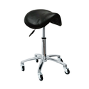 Tabouret selle de cheval en PU noir avec base en forme d'étoile équipée de 5 roulettes anti-cheveux et d'une structure métallique.