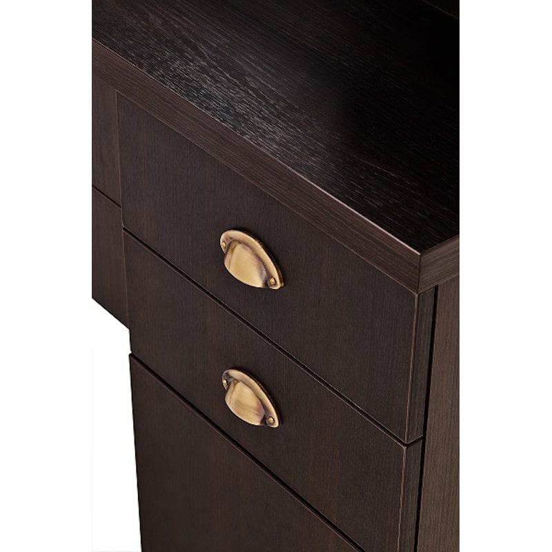 Coiffeuse barbier à la structure en bois mélaminé brillant ou mat équipée d'étagères de rangement.
