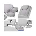 Le dossier intègre une tête amovible multiposition avec un trou visage et deux coussins (rectangulaire et en fer à cheval) pour s’adapter aux positions face vers le haut ou vers le bas. Les accoudoirs réglables par levier sont dotés de coussins amovibles pour soulager les épaules.