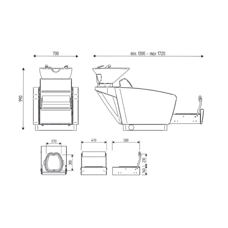 Bac shampoing avec un compartiment extractible pour pédicure, repose-pieds inclinable et bol amovible. Vasques avec nouveaux mitigeurs "minimal" compactes et douchettes flexibles noires.