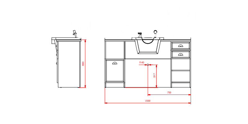 Mobile da barbiere con struttura in legno verniciato e modanature in legno massello con piano di lavoro rivestito in vetro protettivo.