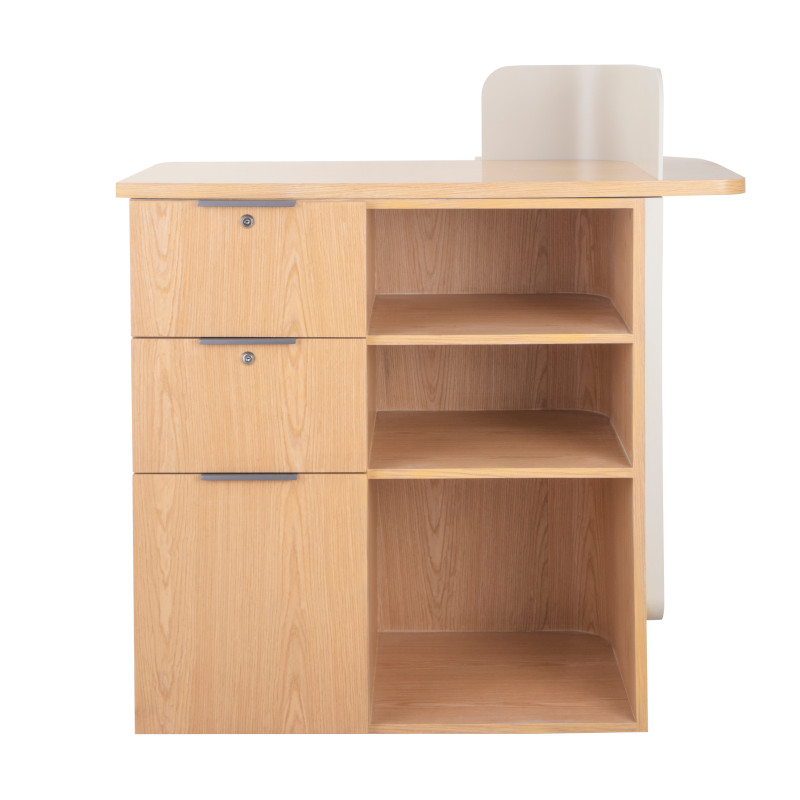 Box reception in MDF legno chiaro con frontale bianco dotato di cassetti con serratura e numerosi vani portaoggetti