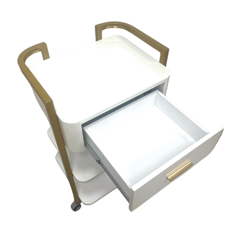 Découvrez le guéridon MIELYun chariot de rangement élégant et fonctionnel, idéal pour les instituts de beauté et centres esthétiques. Son design moderne et sophistiqué allie une structure métallique avec une finition dorée et surface en bois MDF laquée blanche, ajoutant une touche d'élégance à votre espace professionnel et garantissant durabilité et facilité d'entretien. Équipé d'un tiroir spacieux pour organiser votre petit matériel essentiel, ainsi que de 2 étagères ouvertes idéales pour garder à portée de main crèmes, instruments et autres accessoires. Doté de roues pivotantes, ce chariot permet un déplacement fluide et confortable dans votre espace de travail. Son design ergonomique et élégant grâce à ses lignes courbes et ses détails minimalistes s'intègrent parfaitement dans un environnement professionnel de beauté.