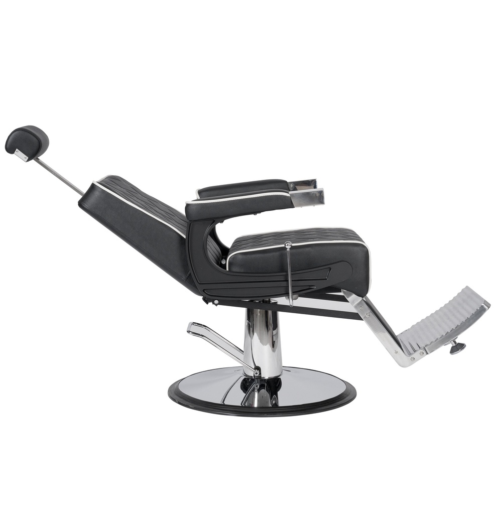 Le Fauteuil de barbier DAVE est un mobilier professionnel destiné aux salons de coiffure et aux barbershop. Il profite d'un design élégant et sa fabrication est dotée de pièces en aluminium injecté et une structure intérieure métallique très solide. La base ronde chromée ajoute une touche de sophistication. Le siège est doté d’une mousse haute densité pour un confort et une durabilité optimale. Le revêtement est fini avec un capitonnage aux coutures blanches sur un cuir noir afin de lui apporter encore plus de style.