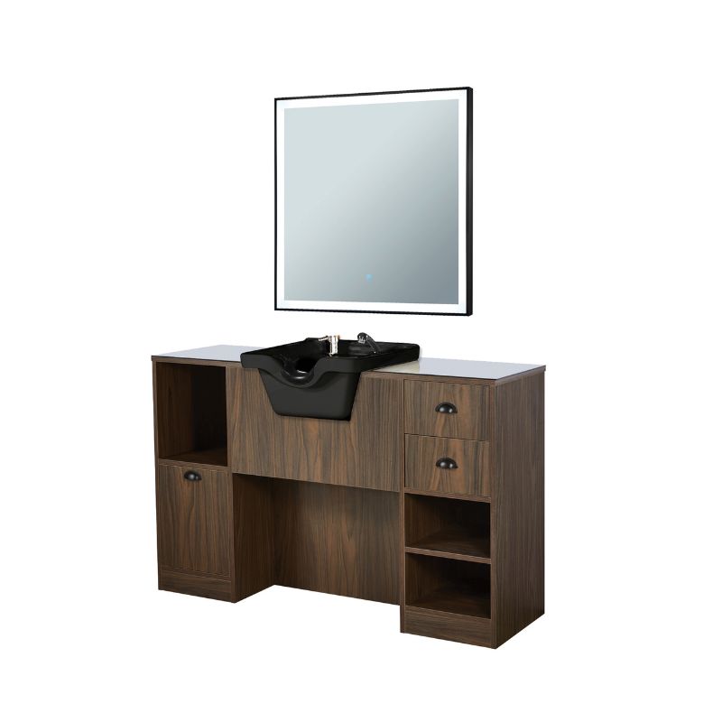Coiffeuse meuble barbier en bois foncé avec miroir en forme carré élégant et vasque blanche ou noire. Idéale pour les barbershop.